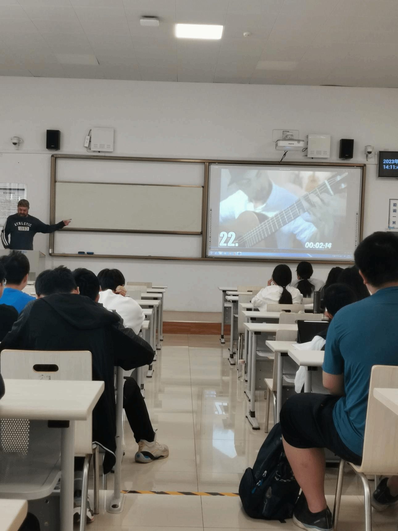 2023 年 5 月 29 日, 外教 Jimmy 主持了一次主题为“Music in The World”的英语沙龙,Jimmy通过梳理不同国家各时代有代表性的音乐潮流与作品,包括曾经流行过的乡村音乐、摇滚乐、蓝调等等,介绍了音乐的文化功能、语言特色,同时讲解了关于音乐方面的专业词汇。活动形式生动活泼,同学们听得如痴如醉,很多人表示受益匪浅,获益良多。