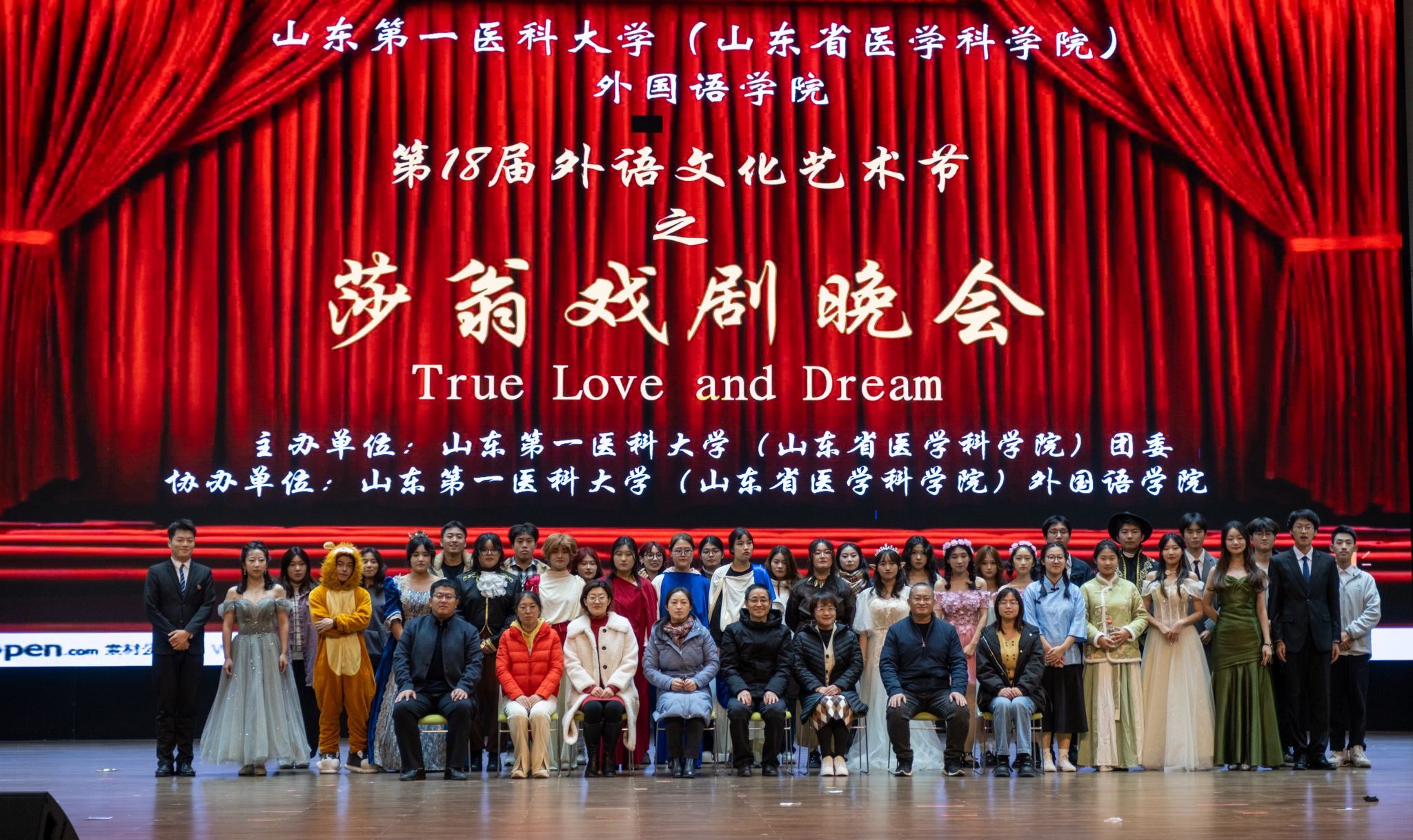 12月9日晚,beat365(山东省医学科公司)beat365亚洲体育官方网站“True Love and Dream”第十八届外语文化艺术节之莎翁戏剧晚会在老员工活动中心隆重举行。公司党委副书记武军,翻译系主任祝远忠,英语系王慧,医药管理公司杨苗苗,化学与制药工程公司王晗硕,学工办主任宋雪,团委书记古鹏飞,辅导员刘建、王云萍与同学们欢聚一堂,共同领略莎翁戏剧的魅力和精彩。