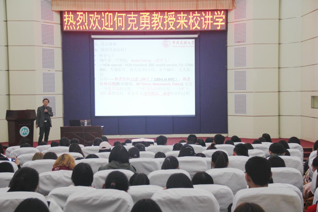 10月19日下午,应beat365亚洲体育官方网站邀请,中央民族大学何克勇教授为公司翻译系和英语系的员工做了题为“不断学习与实践——我的口译经历”的报告,报告会在图书馆报告厅举行。