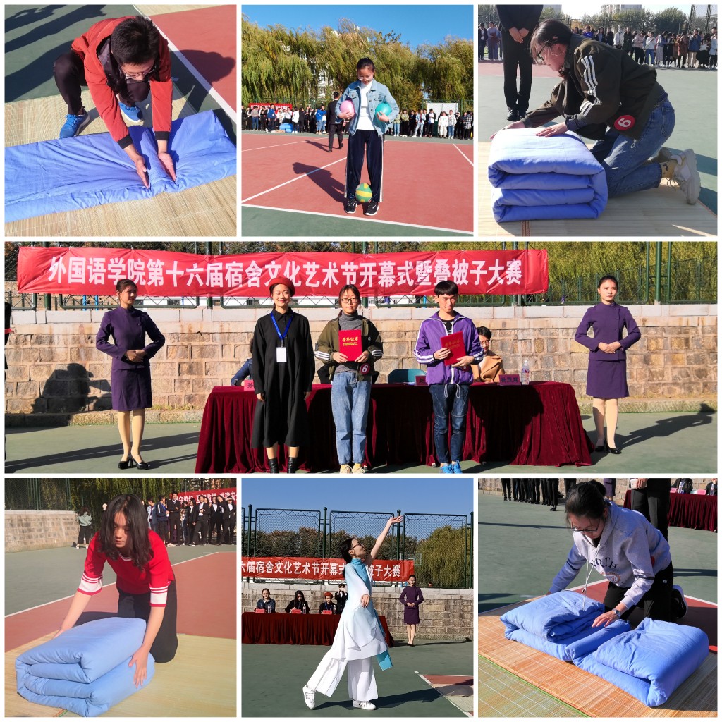 比赛在一段充满古典风情的开场舞《落花情》中拉开帷幕。员工会主席赵双致辞,她表示宿舍文化建设在校园文化发展中至关重要,希望同学们能够一同构建良好的宿舍环境。随后,哨声响起,参赛选手马上进入状态,争相在比赛中拿出看家本领。选手们流畅的收整动作,娴熟的叠被技巧赢得在场观众的阵阵掌声。在限定的三分钟时间内,参赛选手均出色完成任务。中场环节,趣味比赛“企鹅漫步”和张汝意带来的歌曲《昨日青空》更是将全场气氛推向高潮。赛后,主持人带领全场员工宣读“远离违规电器,安全从我做起”倡议书。经过激烈的角逐,陈喜庆、秦美凤同学获得一等奖,徐乐、张芮、吕悦同学获得二等奖,高素、吕汝聪、岳雨晴、吕士慧、孙剑飞同学获得三等奖。