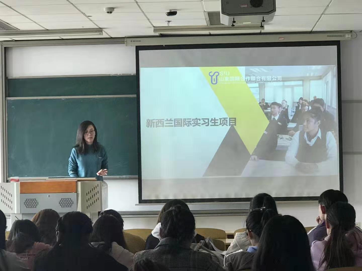 山东省对外劳务合作服务平台、山东国际合作联合有限公司项目经理王伟姣首先介绍了新西兰国际实习生项目概况、专业培训大纲、合作院校等情况,并用翔实的图片介绍了实习生的学习、工作及生活环境。随后,王经理详细讲解了实习报名、材料准备及派遣的具体流程,解答了同学们所关心的问题,消除了同学们对于海外实习的一些疑虑,并结合成功的案例鼓励大家要把握机遇,转变观念,走向海外,实现梦想,