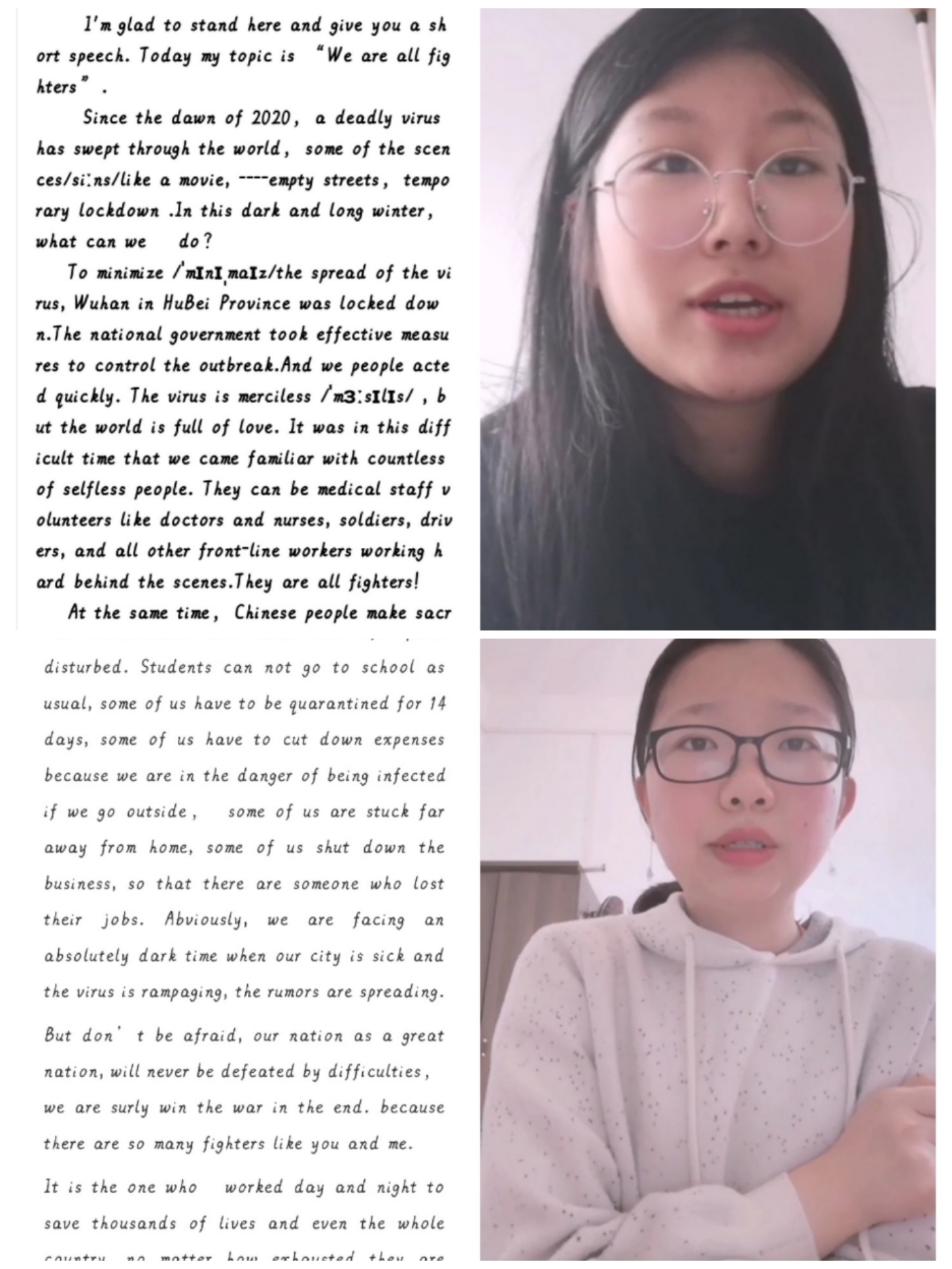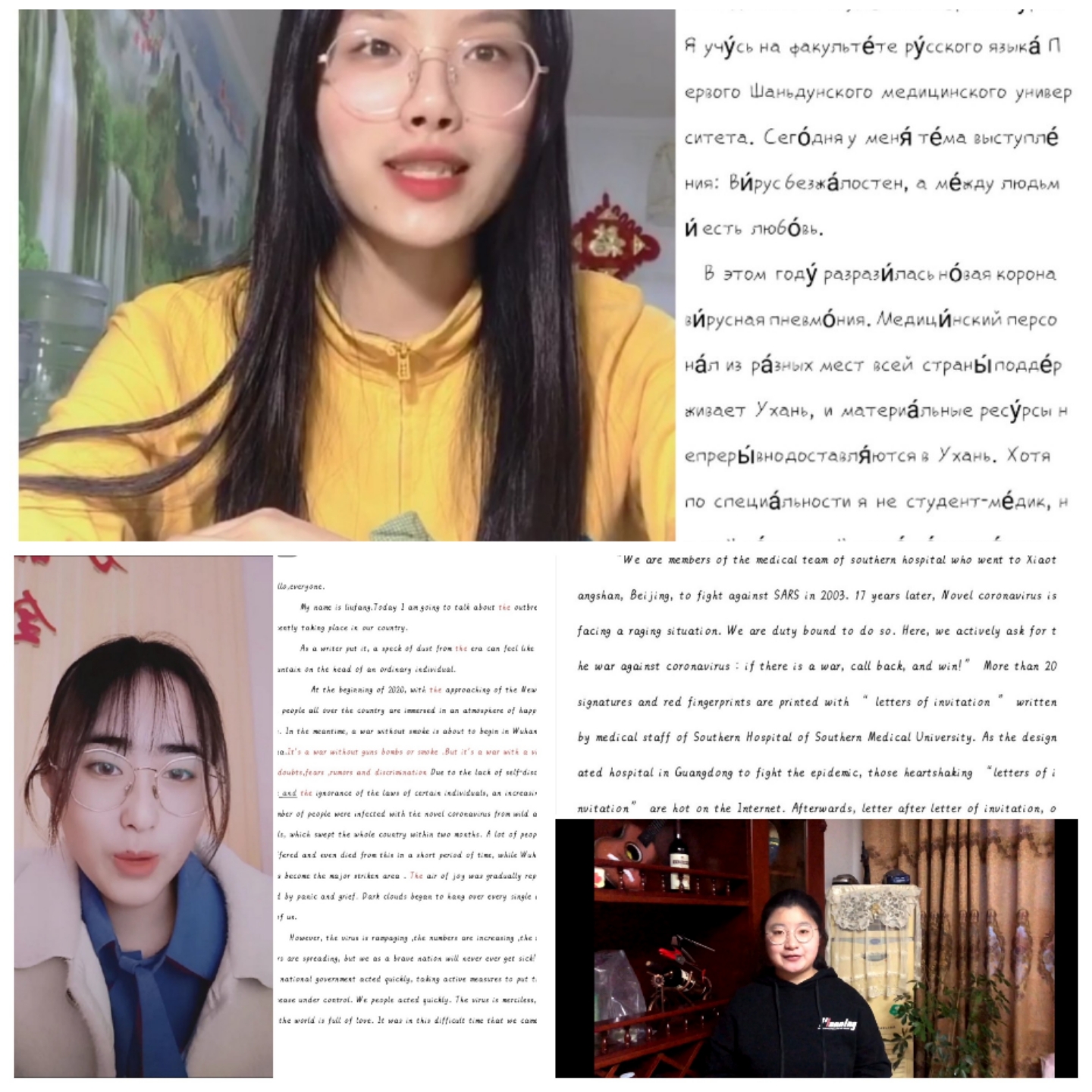 本次比赛采用线上评选的方式进行,各位选手结合本专业特色进行演讲并录制视频,交由评委老师线上打分评选。视频中,参赛选手们围绕主题侃侃而谈,从不同角度、层面诠释着自己对新冠肺炎的认知与了解,畅谈青年对疫情防控的行动与担当。其中,来自英语专业的刘羽佳同学发音地道、表达流畅,她用真挚的情感、鲜活的事例讲述了广大人民群众在抗击疫情道路上的奉献与坚守精神,博得了评委们的一致好评。来自俄语专业的张琦同学围绕抗击疫情和爱国精神,呼吁广大学子提升科学素养和人文情怀,坚定爱国力行的使命责任。经过激烈的角逐,刘羽佳、邢彩文获得一等奖;毛源萍、张瑞敏、张琦获得二等奖;徐雪、谢小燕、刘芳、谢文亚获得三等奖。