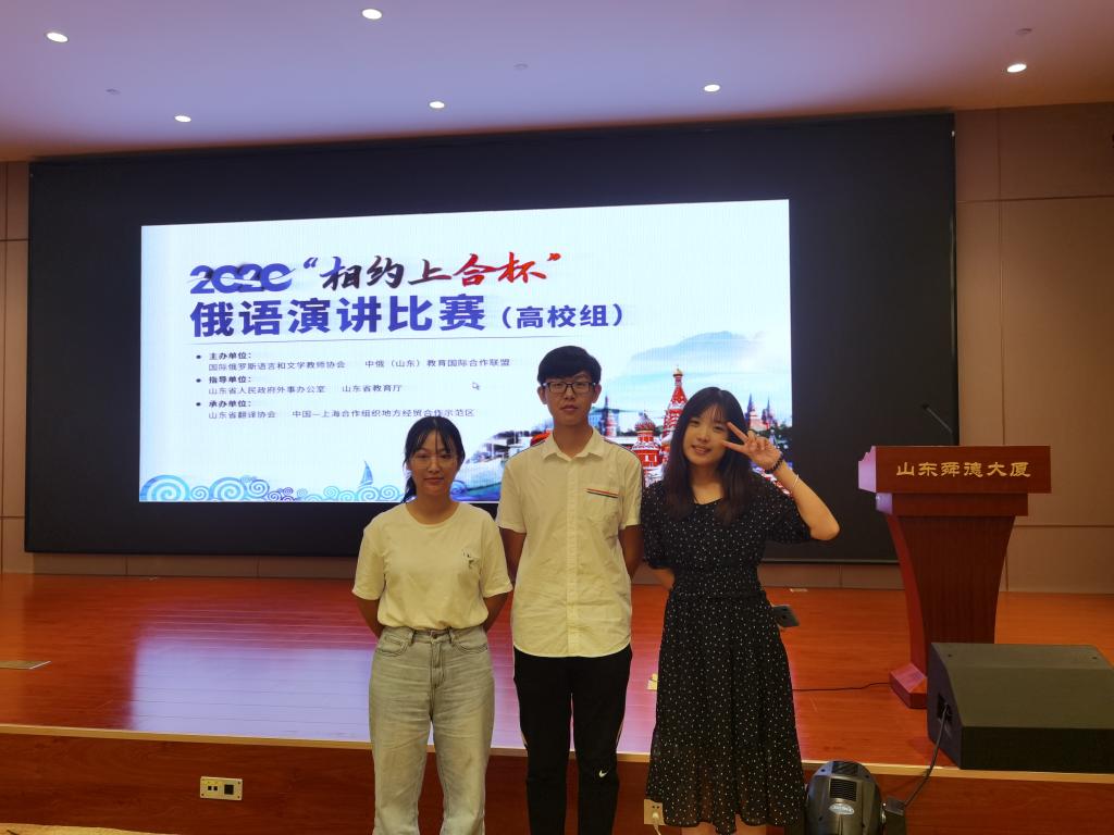 2020年9月25日,山东省首次自主举办的2020“相约上合杯”俄语演讲比赛(高校组)在济南举行。来自山东省内31所高校的84名员工齐聚济南,共享这一俄语届盛事。beat365亚洲体育官方网站俄语系选派的高雪同学和于颜翠同学以良好的语言面貌和饱满的热情在众多选手中脱颖而出,分获两项一等奖;高泽祥同学荣获三等奖。另外,公司还获得组委会颁发的“大赛优秀组织单位”奖。