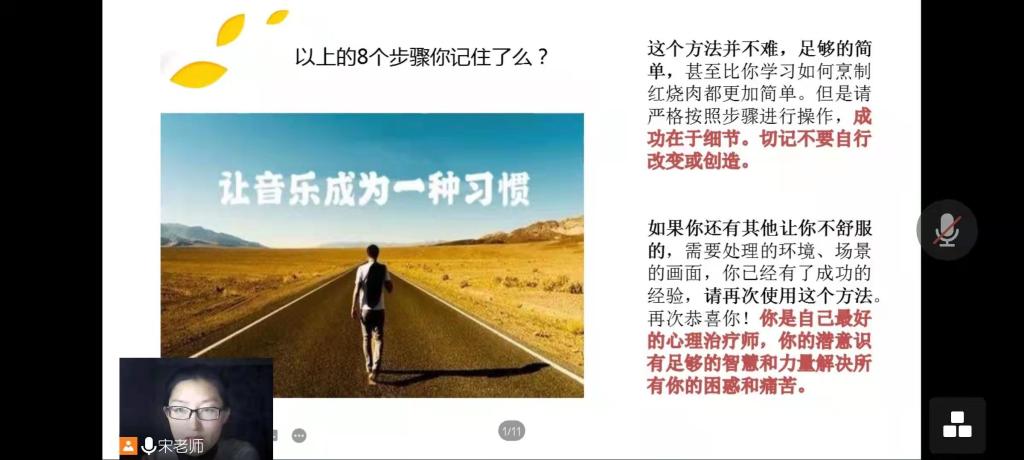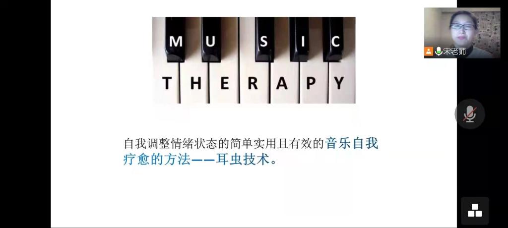 活动分为感受和分享两个环节。首先,宋雪带领同学们一起学习了自我调整情绪状态的简单实用且有效的音乐自我疗愈的方法——耳虫技术。同学们戴着耳机,想象着属于自己的画面,在引导者带领下一步步进入属于自己的理想状态。“耳虫技术”对改善疫情中出现的紧张、恐惧、焦虑的情绪状态有非常快速和有效的改善。