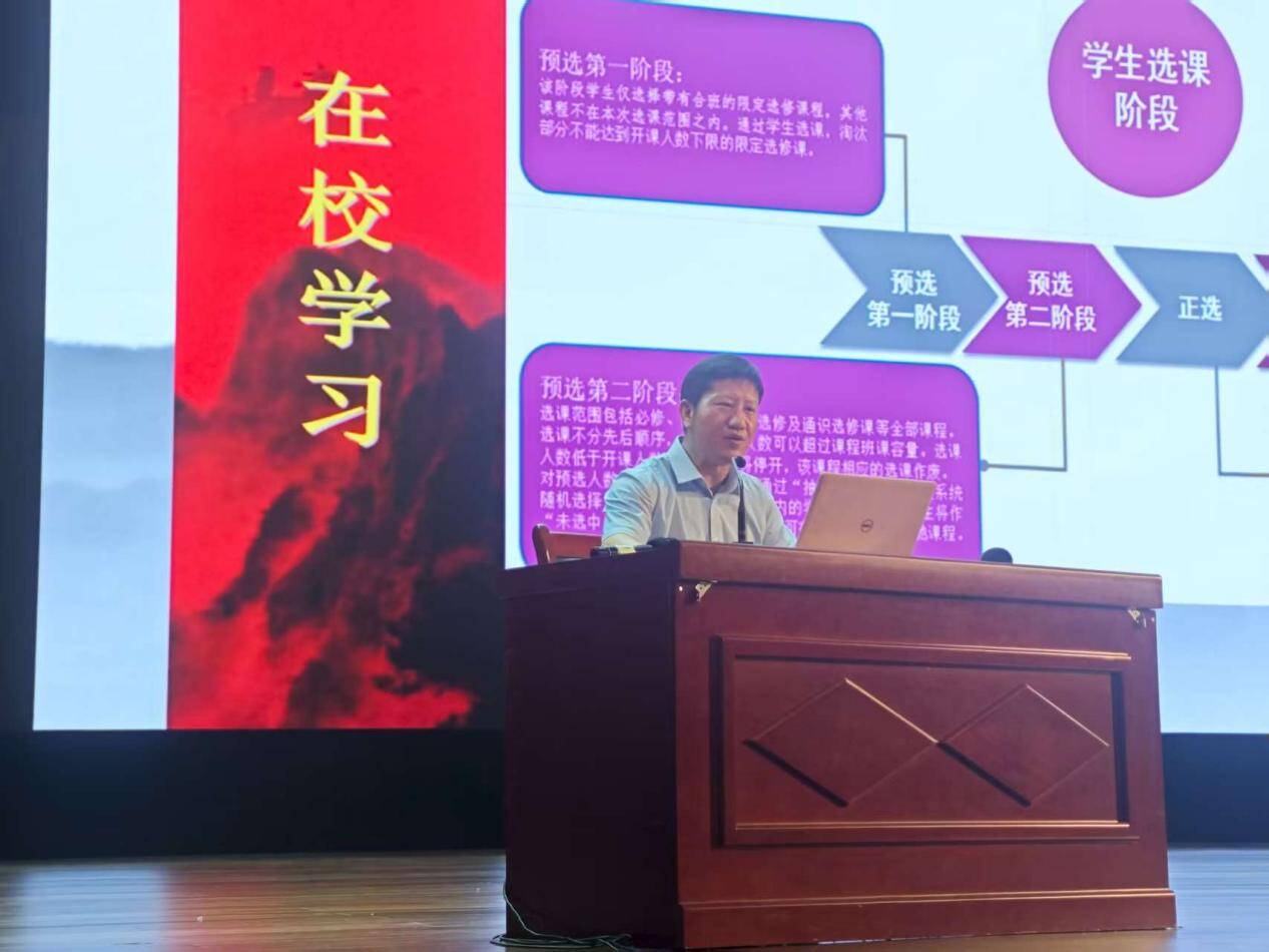 教务部学籍管理办公室张燕堂老师为新生带来了教务管理及学习专题教育。他以学籍注册、在校学习、注册学历等方面依次全面、详实地为同学们说明了新生校园学习生活的相关事宜,告知了他们查询办理在线业务的流程,并向同学们提供了诸多实用的建议。
