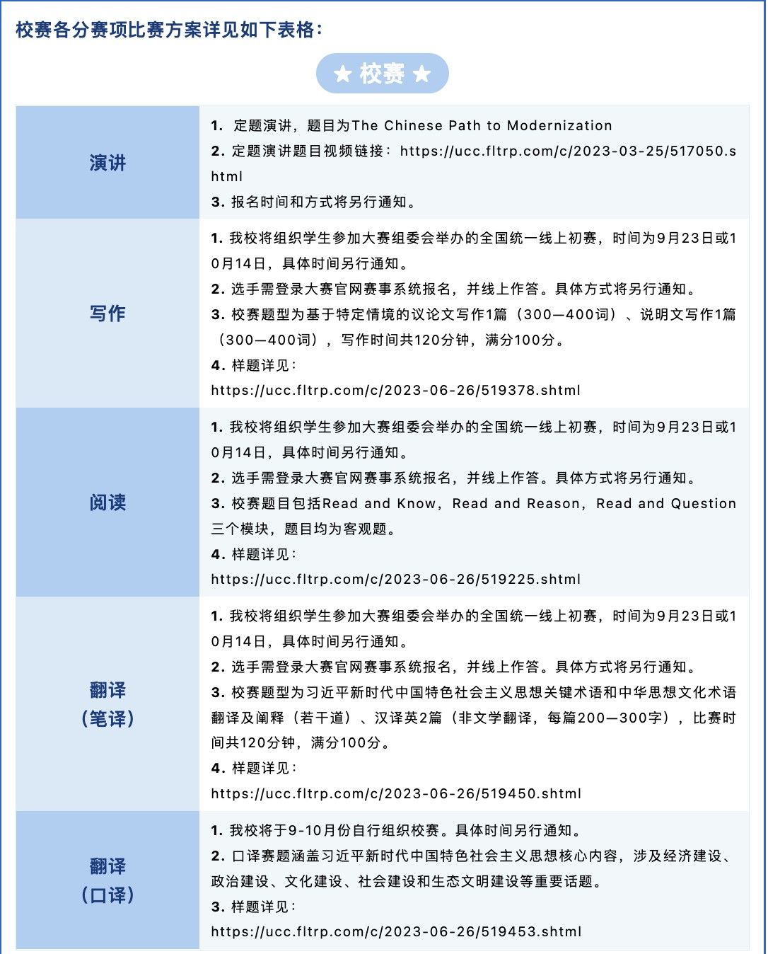 大赛将采用校赛、省赛、国赛三级赛制。公司(院)将于2023年9-10月份组织英语组校赛和俄语组校赛。英语组校赛面向全校本科生、硕士研究生和外籍职工,设置演讲、写作、阅读、翻译(分笔译、口译)分赛项,俄语组面向俄语专业本科生,设置综合赛项一项。大赛部分赛题素材选自《习近平谈治国理政》(一至四卷)以及党的二十大报告等。有意参赛的同学请认真阅读和学习相关备赛书目,做好参赛准备,有针对性地打磨语言技能,精准提升演讲、写作、阅读、笔译、口译等外语应用能力,丰富知识储备,增强文化意识。